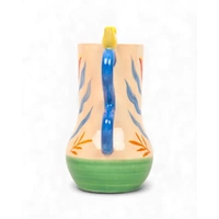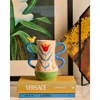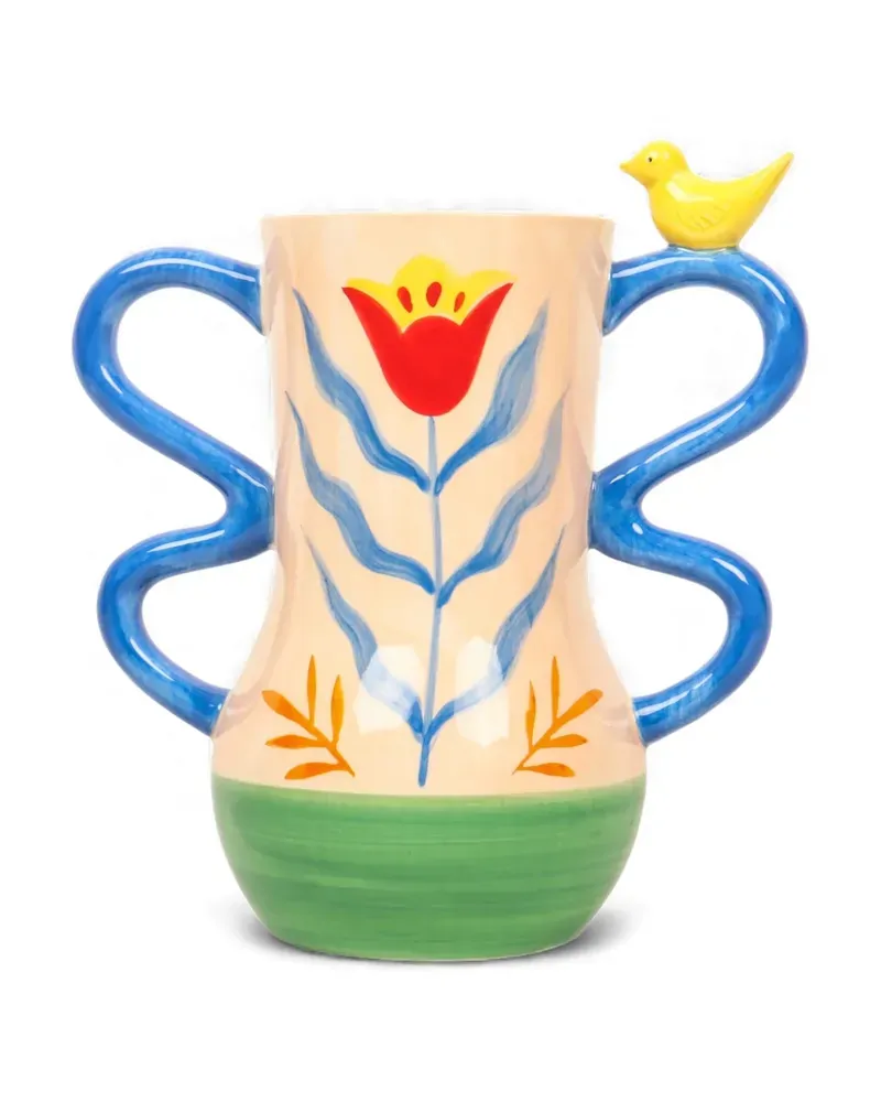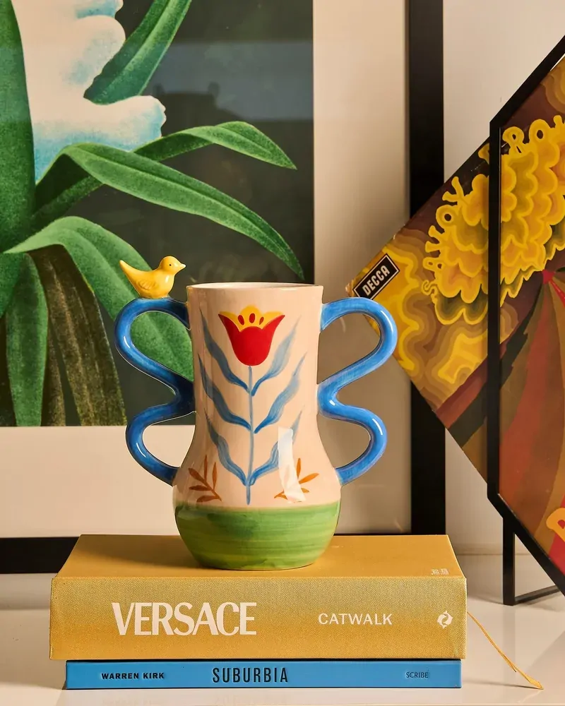 Bring colour and character into your home with the Retro Folk Stoneware Hand Painted Vase. Inspired by traditional folk art, this vibrant piece features a warm cream base decorated with bold hand-painted style florals in red, blue and yellow, complemented by leafy accents and a fresh green base. Crafted from durable stoneware, the vase is designed with beautifully sculpted curved handles that add a playful, artistic touch. A charming yellow bird perched on one handle creates a delightful decorative detail, giving the piece a whimsical and nostalgic feel. Perfect for displaying fresh flowers, dried stems or greenery, this statement vase instantly brightens shelves, dining tables, sideboards or entryways. Its cheerful colours and folk-inspired motif make it easy to style in eclectic, vintage or nature-inspired interiors.