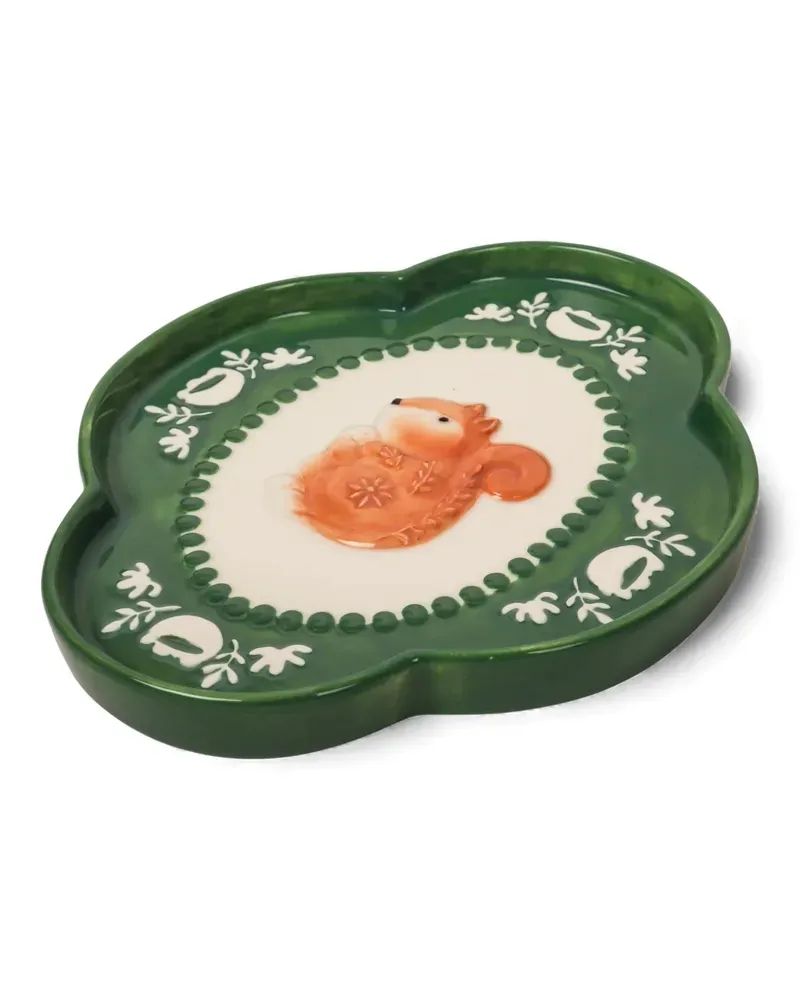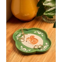 Playful and full of charm, the Retro Folk Stoneware Nutty Dish is a decorative accent designed to bring warmth and personality to everyday spaces. Crafted from glazed stoneware, this dish features a softly scalloped shape with a hand-painted squirrel illustration at the centre, framed by folk-inspired detailing in rich green and creamy neutral tones. Perfectly sized for holding rings, earrings, keys or other small essentials, this versatile dish is ideal for styling on a bedside table, vanity or entryway. The glossy finish highlights the raised detailing and enhances the vibrant colour palette, making it as eye-catching as it is practical. The folk-style illustration and sculptural form give this dish a nostalgic, handcrafted feel that suits a range of interiors, from modern eclectic to cosy, character-filled homes. Whether used daily or styled as a decorative piece, it adds a joyful touch wherever its placed. Part of the Retro Folk collection, the Nutty Dish pairs beautifully with coordinating designs for a cohesive look. Ideal as a thoughtful gift or a charming addition to your own home, it celebrates colour, craftsmanship and playful design in a small but impactful way.