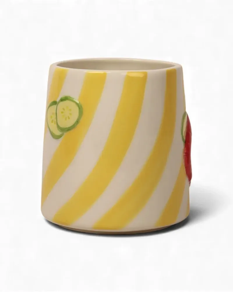 Brighten your daily coffee or tea ritual with the Seaview Stoneware Asparagus Mug, a playful piece designed to bring colour and character to your drinkware collection. Crafted from glazed stoneware, this mug features hand-painted yellow and cream stripes accented with raised asparagus detailing on the handle, creating a joyful, tactile design that feels both fun and considered. The generously sized shape sits comfortably in the hand, making it perfect for morning coffees, afternoon teas or cosy soups. Its sturdy stoneware construction helps retain warmth, while the glossy finish enhances the vibrant colour palette and gives the mug a polished, high-quality feel. Designed to be as decorative as it is functional, the Asparagus Mug adds personality to open shelving or kitchen benches when not in use. Mix and match with other Seaview mugs to create an eclectic, collected look that celebrates playful design.