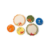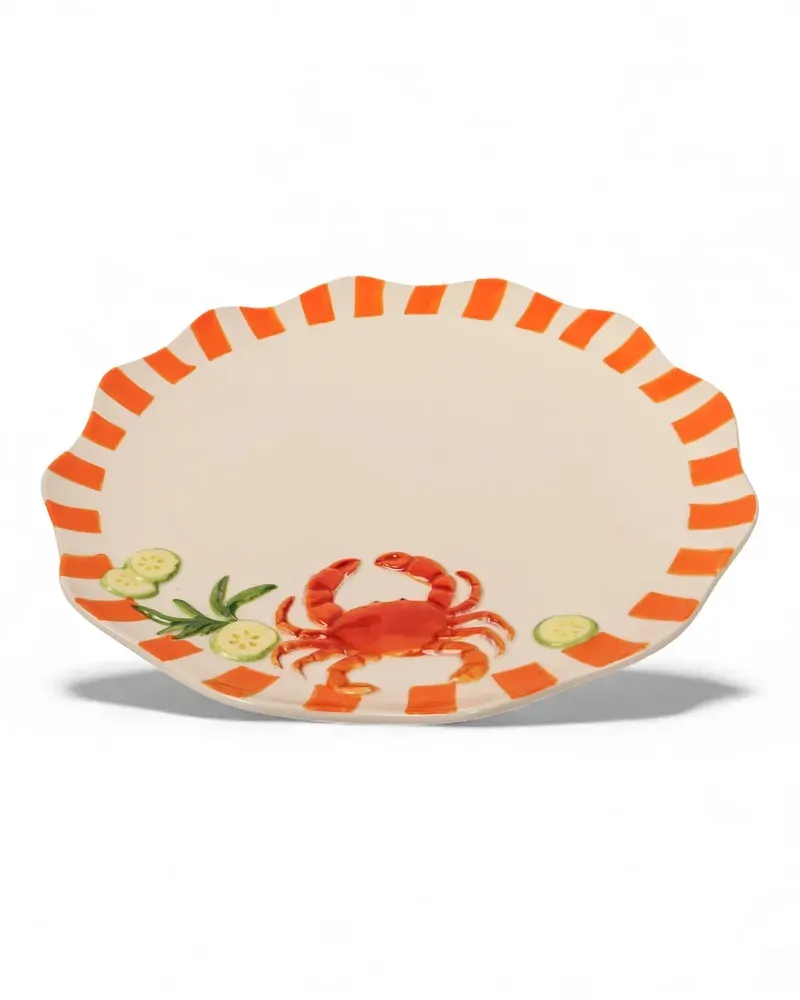 Make every meal feel like a seaside celebration with the Seaview Stoneware Crab Dinner Plate. Crafted from durable glazed stoneware, this generously sized plate features a vibrant, hand-painted design inspired by coastal dining, with playful crab, lobster and shell motifs brought to life in warm yellows, reds and fresh green accents. The softly scalloped edge and bold striped border give the plate a charming, artisanal feel, while the glossy finish enhances the colour and hand-painted details. Designed for both everyday use and entertaining, this dinner plate is ideal for serving mains, shared dishes or relaxed long lunches with friends and family. Its substantial stoneware construction offers a satisfying weight and durability, making it as practical as it is decorative. Each plate is individually hand-finished, resulting in subtle variations that add to its unique character and handcrafted appeal.