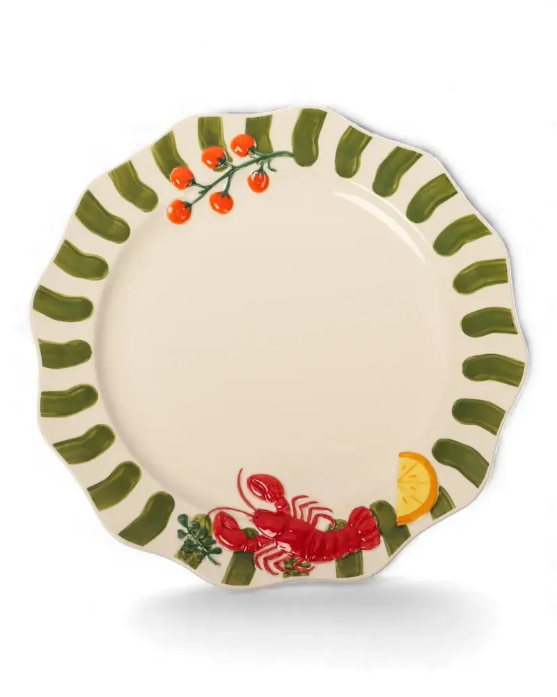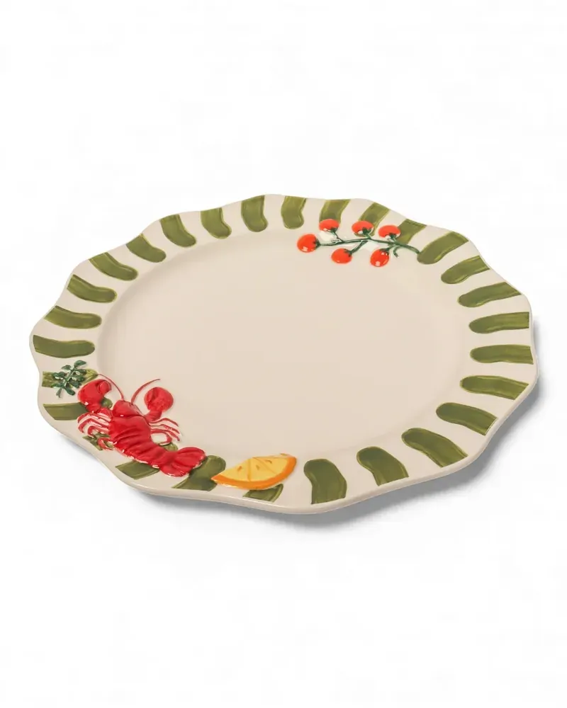 Serve every meal with a touch of coastal charm using the Seaview Stoneware Lobster Dinner Plate. Featuring bold hand-painted style green stripes and playful raised details of a vibrant red lobster, citrus wedge and tomatoes, this unique plate brings a fresh seaside aesthetic to your table. Crafted from durable stoneware, this dinner plate is designed for both everyday dining and relaxed entertaining. The gently scalloped edge and sculptural details add character and texture, making it a standout piece for serving everything from seafood feasts to casual family meals. Perfect for coastal-inspired table settings, the Seaview Lobster Dinner Plate pairs beautifully with other pieces from the Seaview collection to create a cohesive, vibrant look. Its lively design celebrates the joy of seaside living and adds personality to any dining occasion.