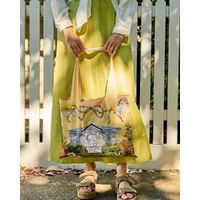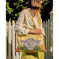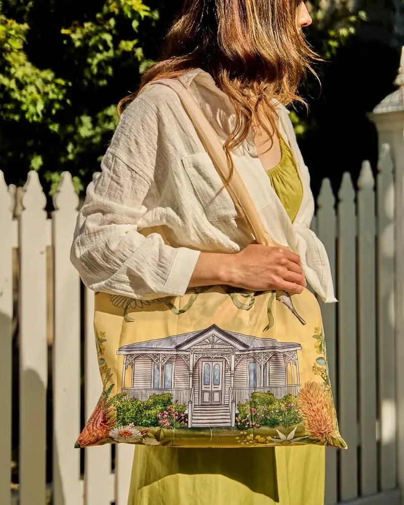 Golden Hour is an ode to light, warmth, and the natural elegance of the Australian landscape, when the sun dips low and the landscape is washed in warm, honeyed light. Illustrated by in-house artist Laura Ramos, this collection captures the nostalgic glow of golden hour through intricate drawings of Grevilleas, succulent oranges, and native blooms, all delicately entwined with flowing feminine ribbons and bows. Hints of soft blue and eucalyptus green contrast beautifully with sun-soaked yellows and earthy oranges, evoking the feeling of a late summer afternoon. Among the designs are charming Queenslander-style homes, a nod to relaxed, open-air living that allows you to bask under the sun all day long. Lightweight yet durable, this foldable shopper offers generous space for groceries, market finds or daily essentials while remaining easy to carry when not in use. The soft fabric handles sit comfortably over the shoulder or in hand, making it ideal for shopping trips, beach days or casual outings. When folded, the bag compacts neatly, allowing it to slip effortlessly into a handbag or backpack so its always ready when you need it.