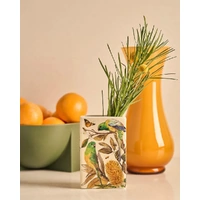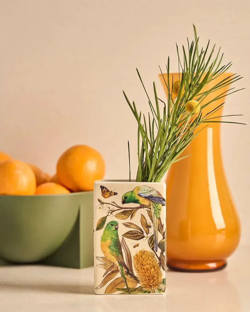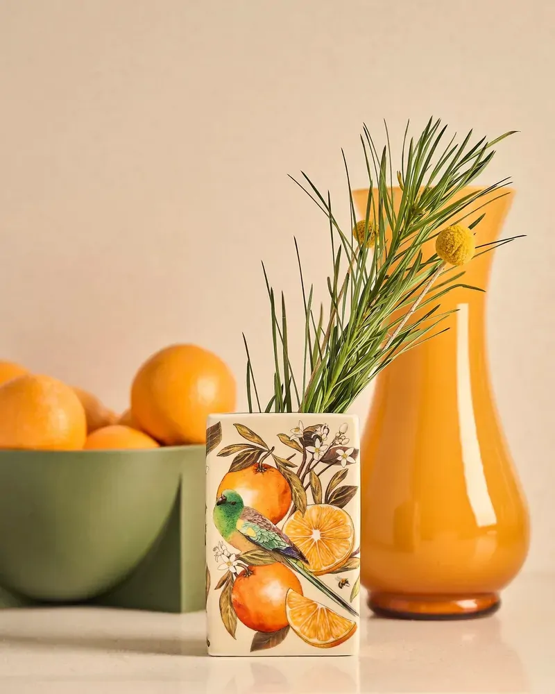 Golden Hour is an ode to light, warmth, and the natural elegance of the Australian landscape, when the sun dips low and the landscape is washed in warm, honeyed light. Illustrated by in-house artist Laura Ramos, this collection captures the nostalgic glow of golden hour through intricate drawings of Grevilleas, succulent oranges, and native blooms, all delicately entwined with flowing feminine ribbons and bows. Hints of soft blue and eucalyptus green contrast beautifully with sun-soaked yellows and earthy oranges, evoking the feeling of a late summer afternoon. Among the designs are charming Queenslander-style homes, a nod to relaxed, open-air living that allows you to bask under the sun all day long. Ceramic vase featuring two unique botanical artworks inspired by citrus and native birdlife. A sculptural statement piece for shelves, tables or flowers.