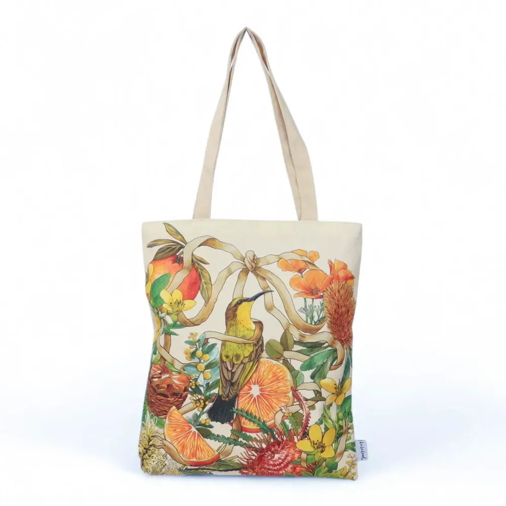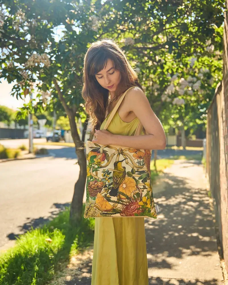 Golden Hour is an ode to light, warmth, and the natural elegance of the Australian landscape, when the sun dips low and the landscape is washed in warm, honeyed light. Illustrated by in-house artist Laura Ramos, this collection captures the nostalgic glow of golden hour through intricate drawings of Grevilleas, succulent oranges, and native blooms, all delicately entwined with flowing feminine ribbons and bows. Hints of soft blue and eucalyptus green contrast beautifully with sun-soaked yellows and earthy oranges, evoking the feeling of a late summer afternoon. Among the designs are charming Queenslander-style homes, a nod to relaxed, open-air living that allows you to bask under the sun all day long.