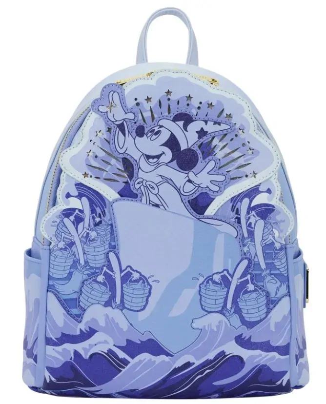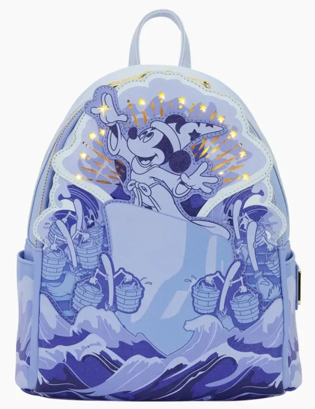 Celebrate a Disney classic in style! This mini backpack is inspired by Disney's Fantasia. You'll find Sorcerer Mickey front and center casting magic (the stars around him light up!). Around him are crashing waves and the Magic Brooms! Gold foil and shimmer faux leather make this an extra special piece! Show off one of your favourite Disney classics with this bag!