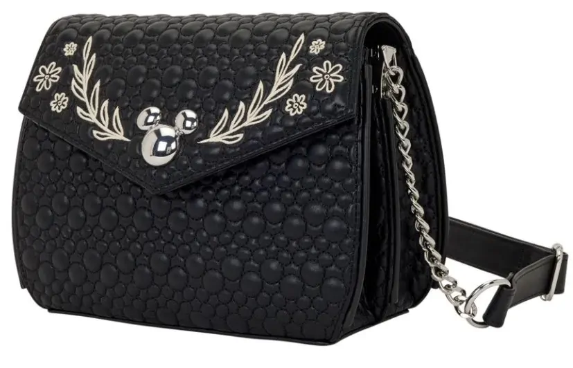 A super cute, timeless Disney crossbody for any occasion! This crossbody features a quilted pattern all over of Mickey Mouse silhouettes. Over the front flap, you'll find a metal charm of Mickey's silhouette, flanked by embroidered flowers and leaves. It's a fun way to add a flourish of Disney magic to your outfit!
