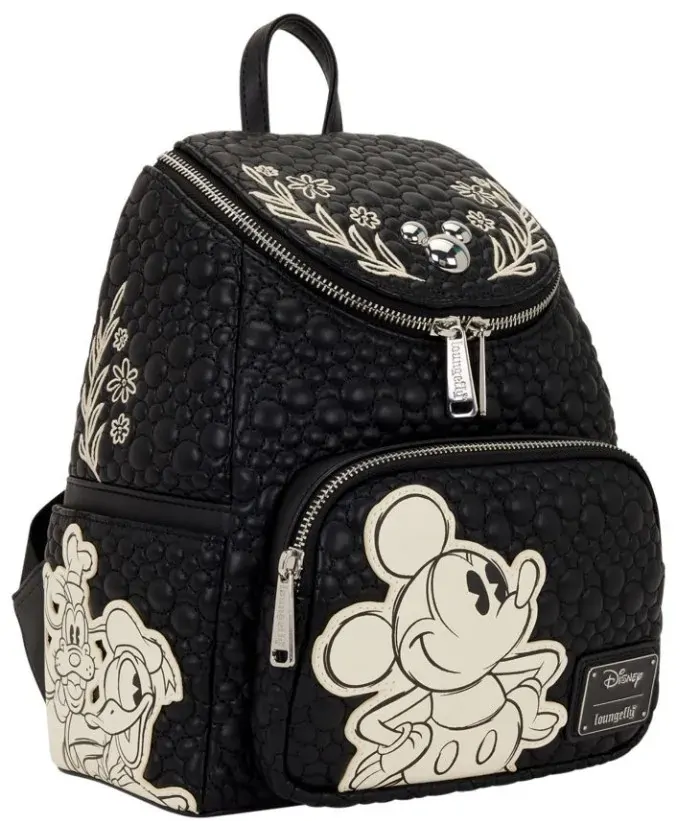 A super cute, new Disney Mickey & Friends style has just been drawn up! This mini backpack features Mickey & Friends "sketched" on the bag against a quilted Mickey-silhouette background. You'll find Mickey on the front pocket while Minnie, Pluto, Goofy, and Donald are on the side pockets! On the top flap of the bag, you'll find a metal charm in the shape of a Mickey head surrounded on either side by embroidered leaves and flowers! This bag definitely goes with any outfit and is ready to be the companion of any Disney fan!