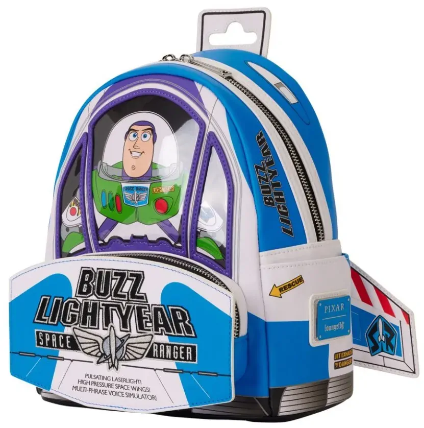 "To infinity and beyond!"This mini backpack is the perfect way to celebrate 30 years of Disney's Toy Story. This bag is in the shape of the Buzz Lightyear packaging you see in the film; it looks like his spaceship with wings sticking out from the side and clear PVC on the front through which you can see Buzz Lightyear. To make it extra special, this bag plays sound and glows in the dark! It's ready to take off on a new adventure with you!