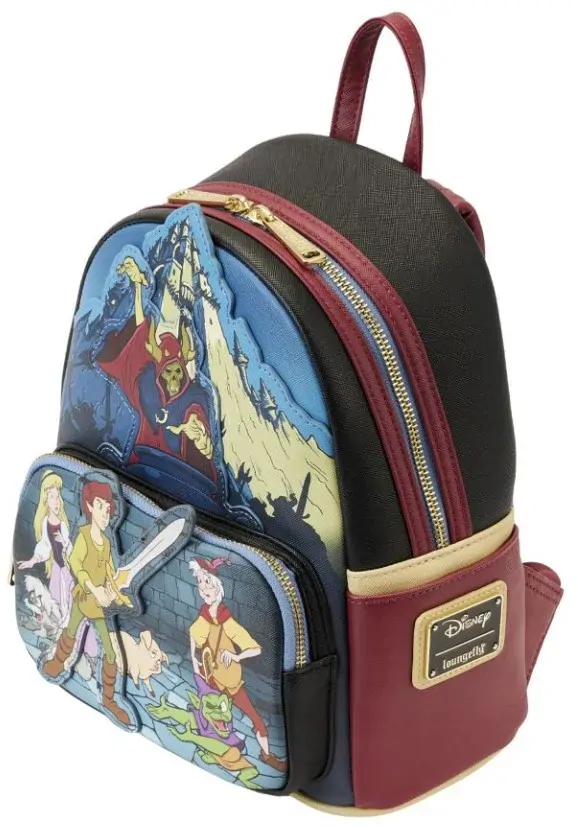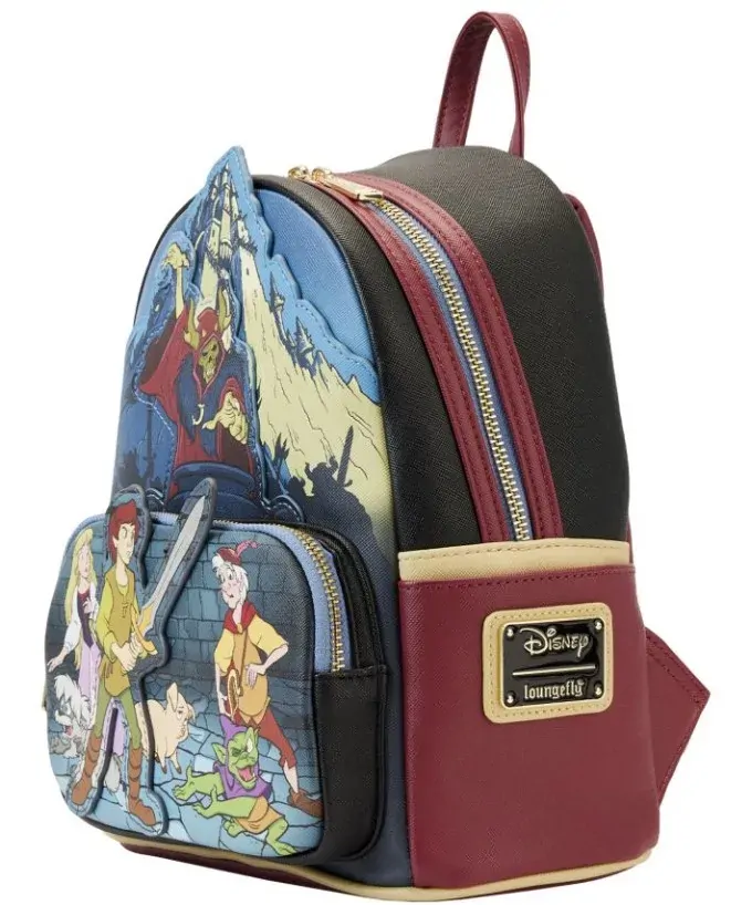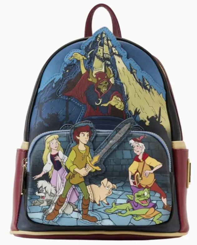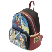 Stir the pot! The Loungefly Disney The Black Cauldron Mini Backpack is brimming with details. On the front of this backpack, the Horned King wields his power over the cauldron, while an army of the "Cauldron-Born" rises up in eerie shadowed silhouettes behind him. On the front zipped pocket, Creeper confronts Taran, who brandishes his sword as he protects Hen Wen, Eilonwy, Gurgi, and Fflewddur Fflam. An enamel zipper charm of the sword finishes off the look in visionary style. On the back, the Black Cauldron makes an encore appearance. Make a frightfully fashionable entrance, wherever your travels may take you.