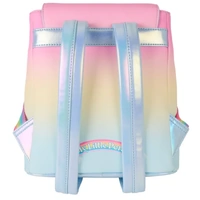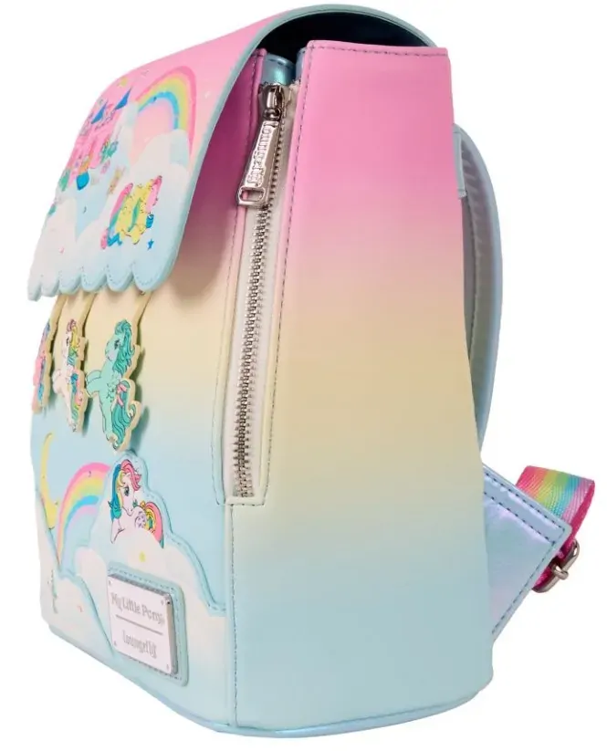A mini backpack of your rainbow dreams! This backpack features a sparkly scene of rainbows and fluffy clouds. Some of your favourite My Little Pony characters dangle from the top flap as faux leather charms. An ombre rainbow background covers the bag and the straps. On the back, you'll find "My Little Pony" written within a rainbow. With a super cute scalloped edge on the top flap and iridescent shine on the straps, this bag makes for a really fun accessory that adds a spark of joy to your 'fit.