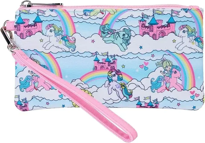 Gallop away with a rainbow of colors! Our My Little Pony Sky Scene Wristlet Wallet is ready for a magical day of fun-filled adventures. This handy wallet features an all-over print of the Dream Castle, suns, clouds, rainbows, and fan-favourite My Little Pony characters, such as Megan (who rides two different My Little Pony characters), Skydancer, Firefly, Starshine, Medley, and Windy. A convenient wristlet strap in pink adds an extra touch of colour. Secure your valuables while taking the reins in style.