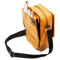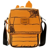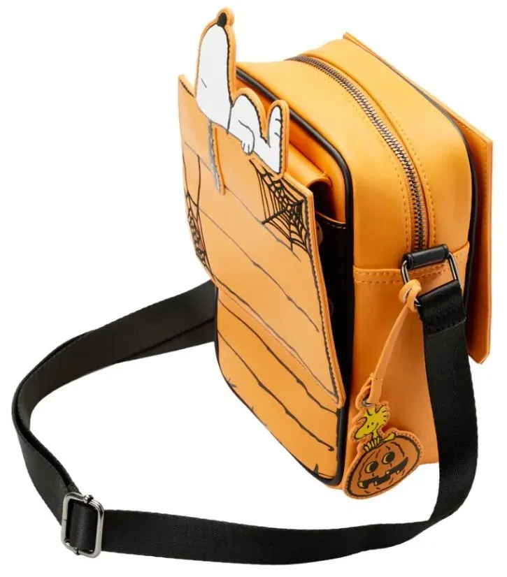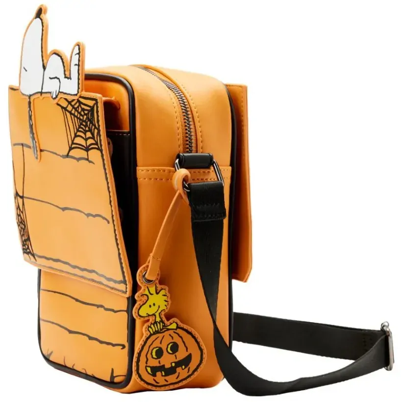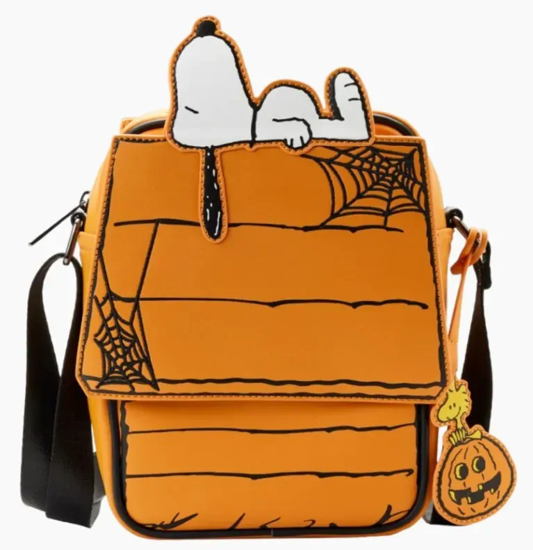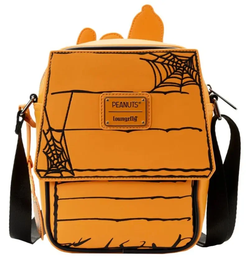 Pick the perfect spot in the pumpkin patch and wait for the Great Pumpkin in style with Loungeflys Peanuts inspired collection! According to Linus van Pelt, the Great Pumpkin is a supernatural figure who rises from the pumpkin patch on Halloween evening, and flies around bringing toys to sincere and believing children. Raise the roof for this crossbody bag! Its full of delightful surprises for a spirited look. This figural bag, in the shape of a doghouse, features Snoopy brought to life in applique detail at the top. While Snoopy snoozes, he might be dreaming of spooky adventures. Embroidered spider webs and a faux leather zipper charm of Woodstock on top of a jack-o-lantern completes the look. Magnetic closures allow you to lift the flap of the roof to find Snoopy with a group of ghosts shouting Boo! Fantastically frightful bats cover the underside, and theres a drop pocket under the flap as well. Its the perfect accessory for packing away treats while waiting for the Great Pumpkin to appearor for turning everyday outings into imaginative adventures.