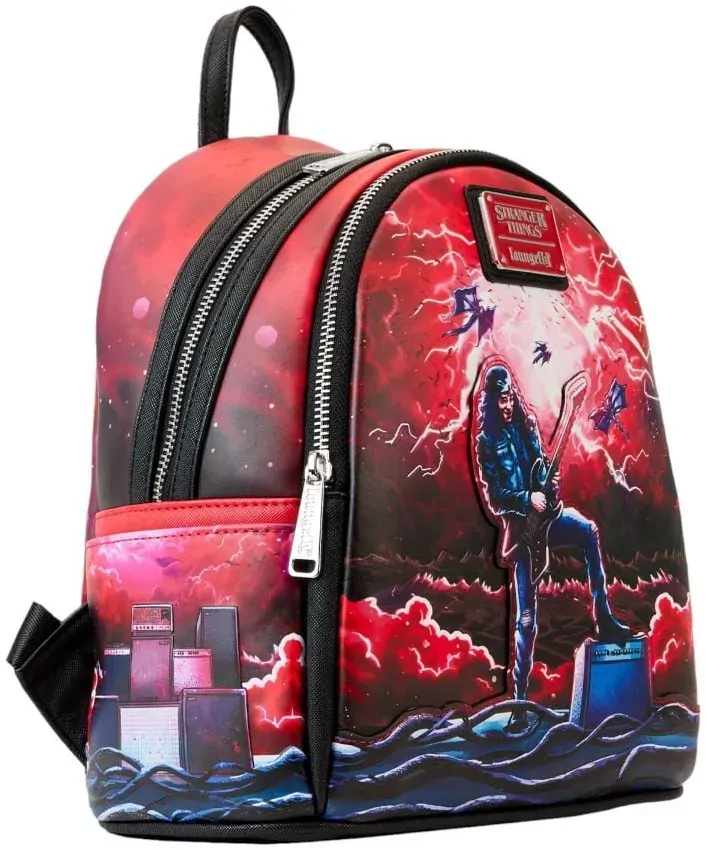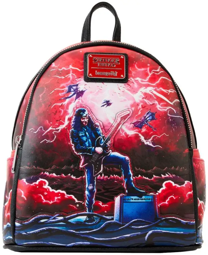 Strike up a storm in the Upside Down with this tribute to Eddie Munson! When a little boy vanishes, a small town uncovers a mystery involving secret experiments, terrifying supernatural forces and one strange little girl. Now in its fourth season set in 1986, Stranger Things sees a new threat emerge. Eddie Munson rocks out on the front of this backpack as Demobats fly through the clouds and lightning strikes. Lightning storm art covers the entire backpack, including the side pockets, which also feature the Creel Mansion on one side and a collection of amps on the other. A hidden pocket in the seam where the front panel meets the top gusset creates extra space for securing smaller items on your journeys. On the back, the Hellfire Club logo appears, and in the dark, the lightning strikes on the front glow. Take on Vecnaor your dayin style and rock your look.