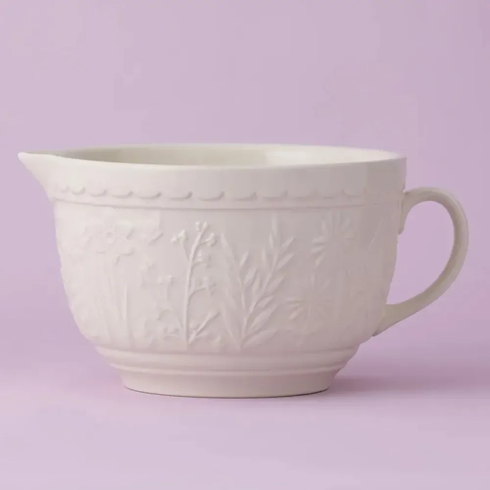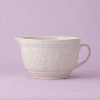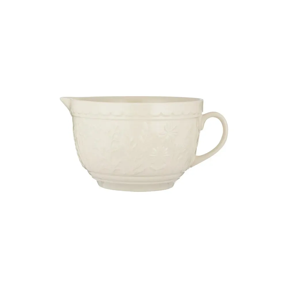 The Mason Cash In the Meadow collection is intricately embossed with delicate florals and foliage, with a beautiful colour palette. A perfect addition to any kitchen. Made from chip-resistant stoneware, the batter bowl is the perfect solution for mixing batter or whisking eggs. Making it an essential item for the everyday baker. The distinct patterned exterior is designed to help bakers grip the batter bowl, whilst the strong handle allows the bowl to remain sturdy and in place when mixing. The batter bowl also features a pouring lip which is ideal when pouring ingredients into cake mixes. The Batter bowls are a classic for Mason Cash, with a high-gloss glaze providing a chip-resistant finish.