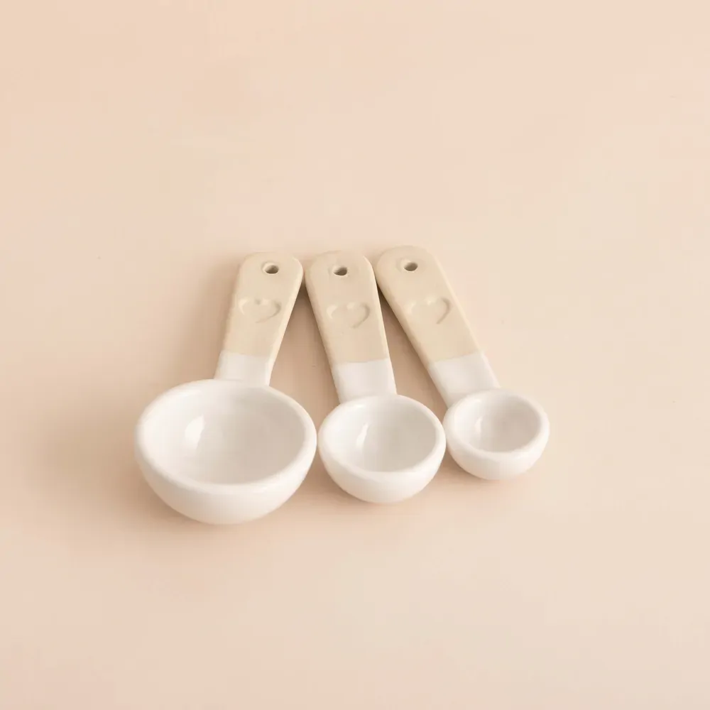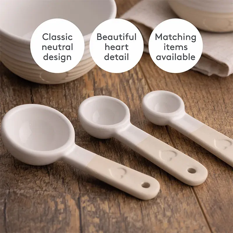 The elegant and sophisticated Rustic Charm collection is inspired by the timeless allure of the French Provincial country kitchens, featuring a subtle debossed heart motif, set in neutral tones and combining a harmonious blend of matt and gloss finishes. The three piece Measuring Spoon set is made from stoneware. The beautiful design is a stylish addition to the kitchen.
