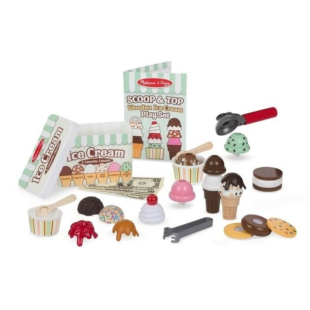 - Includes 2 wooden cones, 2 cups, 6 wooden ice cream scoops, 6 toppings, 4 wooden cookies, 2 wooden ice cream fillings, storage tub with lid, 2 wooden spoons, scooper, tongs, reusable menu and play money