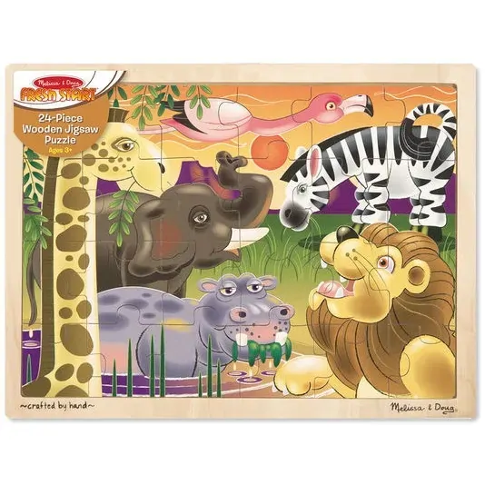 The sun may be setting on the Savannah, but this 24-piece wooden jigsaw provides puzzle fun at any time of day. With a hippo in the watering hole and a flamingo in flight, assembling this jigsaw reveals part of African life with every piece. This educational kids' puzzle comes packaged in a sturdy wooden tray for play and easy storage.