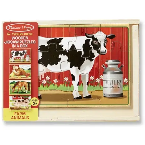 Set includes four wooden, 12-piece farm animal jigsaw puzzles-a hen and her chick, cow, a pig, and a horse-- each stored in a separate compartment of a sturdy wooden box! The slide-on box lid doubles as a convenient puzzle board! Each puzzle piece is shape-coded on the back for easy sorting. Great for travel!