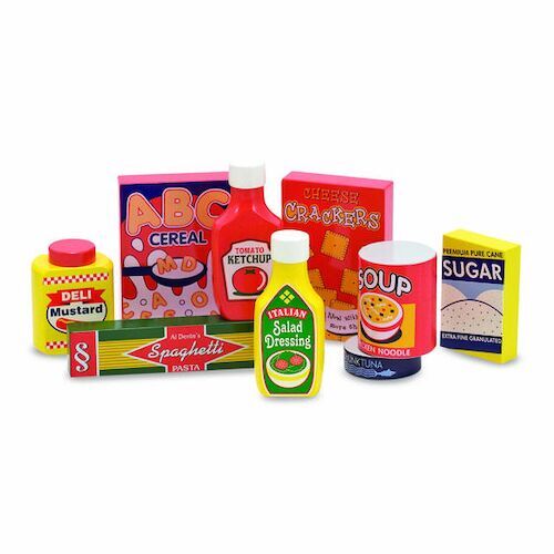 Here are some great staples every little chef needs to have in the pantry. This 9-piece wooden set of dry goods includes tuna, ketchup, spaghetti, soup, sugar, crackers, salad dressing, mustard and cereal.