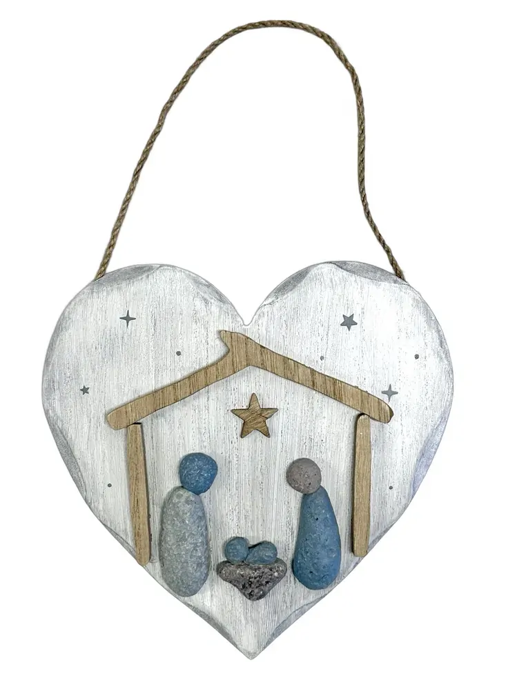 A beautiful MDF wood-look plaque in the shape of a heart with a depiction of the Nativity scene in shades of blue. Comes with a piece of rope attached for easy hanging.