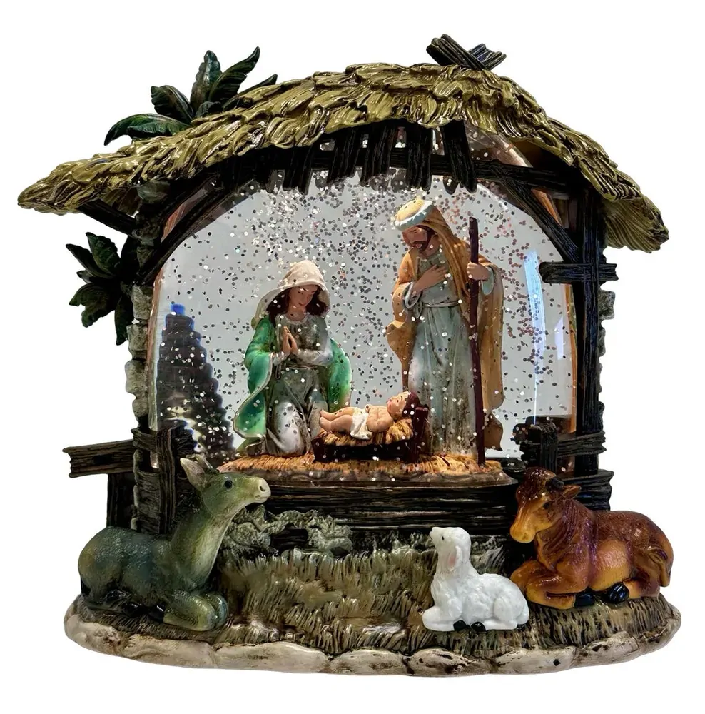 A beautiful nativity set encased in a water ball, with automatic swirling water (with timer) and LED lights.