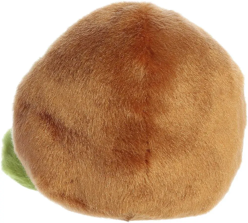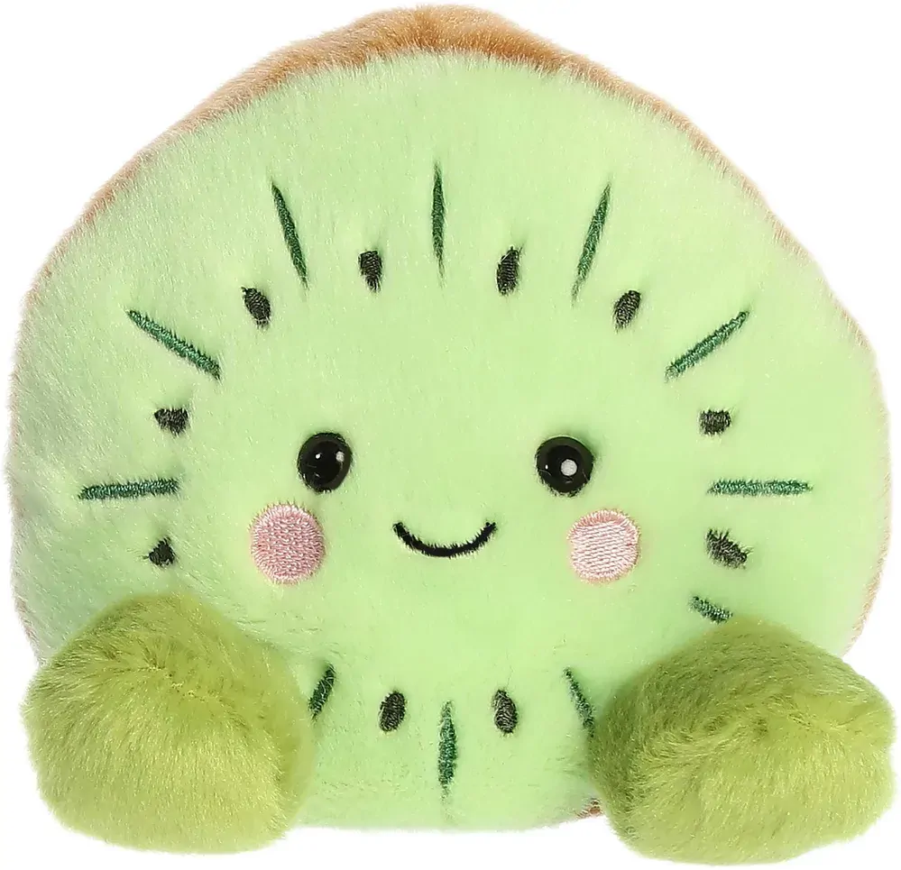 Kimber Kiwi is a delightful kiwi plush representation of the fruit, with a fuzzy lime-green exterior and a soft brown edge, complete with a cheerful face and rosy cheeks.