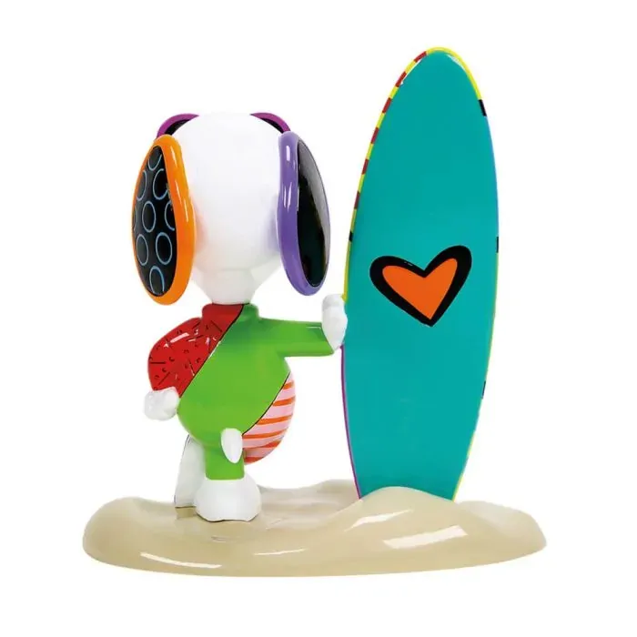 Romero Britto meets Peanuts in this joyful collection celebrating art and happiness. Joe Cool hangs ten on south beach wearing a Britto-decorated wet suit while standing next to a Britto-inspired surf board.