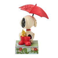 Snoopy and Woodstock find comfort on a rainy day in this peaceful Jim Shore design. Snoopy shelters them under a lily pad umbrella as Woodstock peeks out from a pair of rain boots, enjoying the gentle springtime drizzle. Folk-art details add charm.