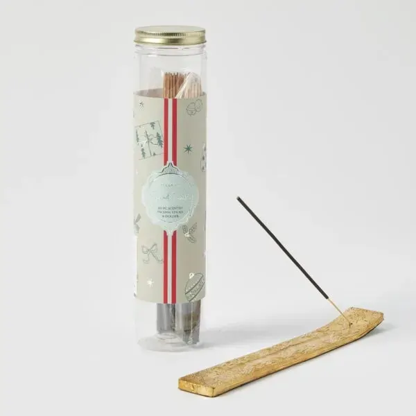 A warm and inviting addition to any home fragrance offering, this set includes 100 spiced vanilla scented incense sticks paired with a beautifully crafted incense holder. Ideal for creating a cosy atmosphere during the festive season or throughout the year. The holder features a gold colour finish and an embossed, botanical-inspired motif that adds both texture and timeless charm. Reusable and compatible with standard incense sticks, this versatile set is well suited for gifting or display as part of a seasonal or everyday home décor collection.