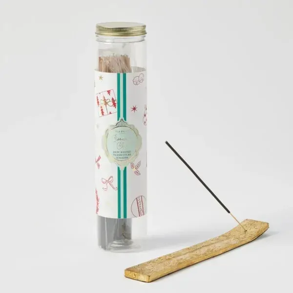 This aromatic set of 100 incense sticks and a coordinating holder offers a comforting blend of cinnamon and orange clove, ideal for creating a festive, cosy ambiance. A warming fragrance for the holiday season, though equally suited to year-round use. The holder is finished in a soft gold colour with an embossed, botanical-inspired design that brings texture and elegance to the set. A reusable piece that pairs with standard incense sticks, making it a thoughtful gift or a refined addition to home fragrance ranges.