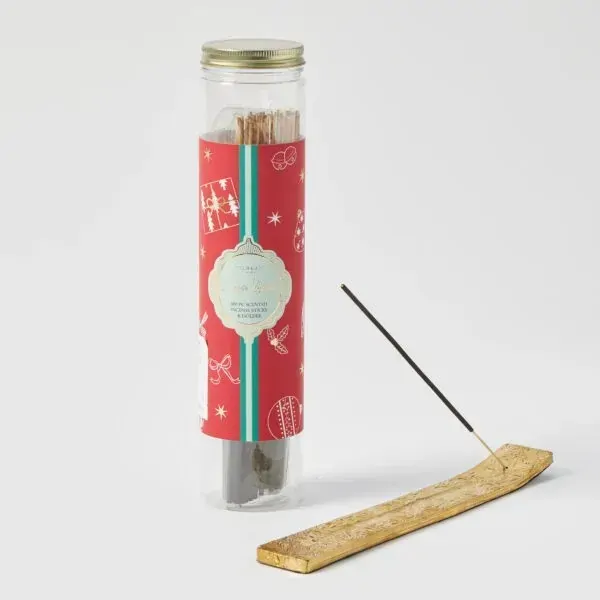 Bring a warm, festive aroma into everyday spaces with the Ginger Bread Scented Incense Sticks with Holder. This generous set includes 100 incense sticks and a beautifully crafted incense holder, perfect for creating a cozy holiday atmosphere. Whether its Christmas or any time of year, bring a touch of comforting warmth to your own space, or gift a loved one so they can enjoy the nostalgic scent of ginger bread in their home. The included holder features a luxurious gold finish with an embossed, botanical-inspired motif that adds texture, charm, and timeless elegance. Its a reusable piece that pairs perfectly with standard incense sticks, making it both a stylish accent and a thoughtful gift.