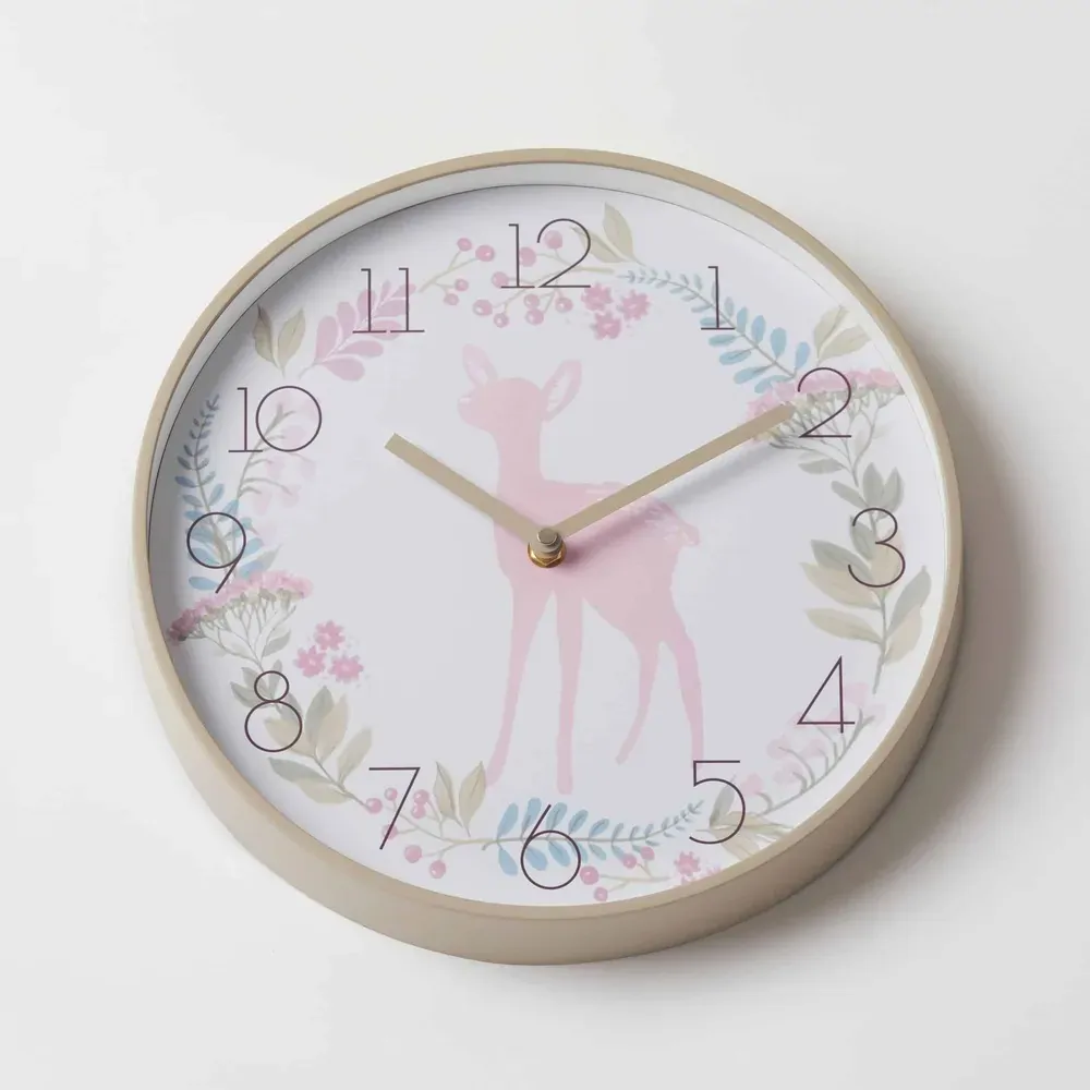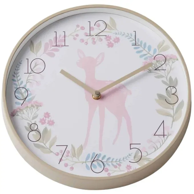 This illustrated analog wall clock is a fun and decorative way to keep track of the time and help children learn to tell time! The lightweight clock has a silent sweeping time motion, powder coated metal hands, acrylic front cover and matching coloured round frame with matte finish.