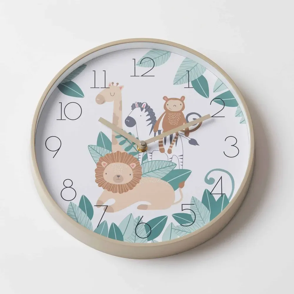 This illustrated analog wall clock is a fun and decorative way to keep track of the time and help children learn to tell time! The lightweight clock has a silent sweeping time motion, powder coated metal hands, acrylic front cover and matching coloured round frame with matte finish.