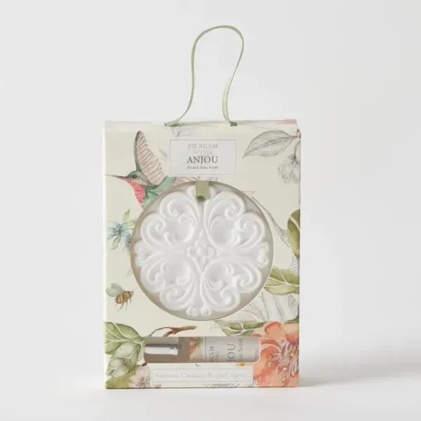 This intricately designed ceramic disc offers a subtle way to fragrance wardrobes, drawers, bathrooms, or other small spaces. Simply spritz with the included 15ml fragrance spray to enjoy a warm scent of Pear with a touch of Floral. Finished with a ribbon for easy hanging, its a thoughtful gift or a charming addition to any home fragrance range.