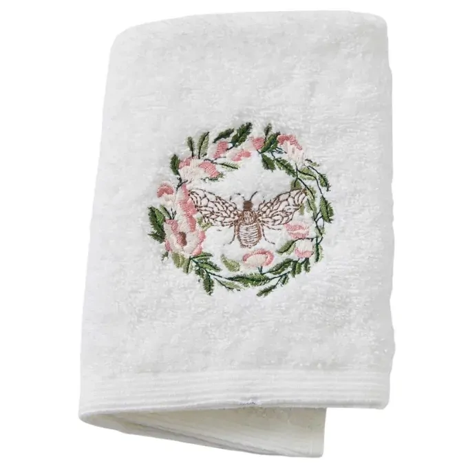 Soft white Face Washer with embroidered motif. Designed in-house. Exclusive to Pilbeam Living.