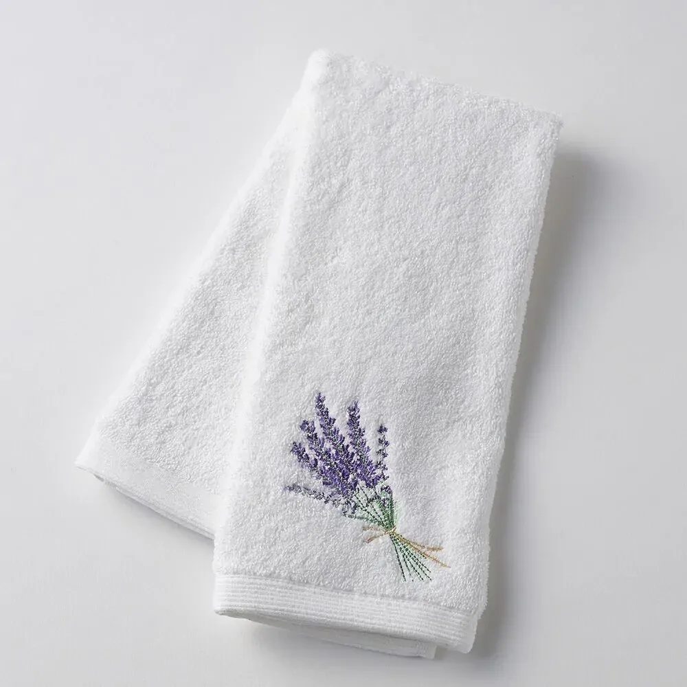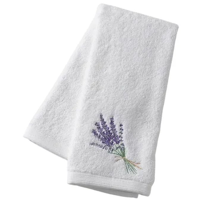 Soft white Hand Towel with embroidered motif. Designed in-house. Exclusive to Pilbeam Living.