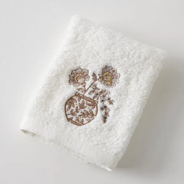 Bring a touch of elegance to everyday rituals with the Pilbeam Living Timeless Blossoms Face Washer. Crafted from soft, absorbent cotton and adorned with intricate embroidery of blooming florals in an ornate vase, this design adds classic charm to any bathroom. A thoughtful gift or an easy way to refresh bathroom styling.