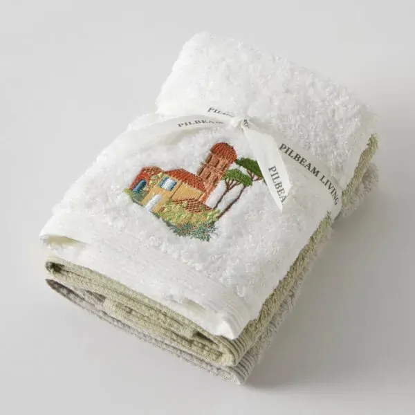 Add a touch of charm to daily routines with the Pilbeam Living Valletta Face Washer Set. This beautifully presented set includes one embroidered design featuring a Mediterranean-style villa surrounded by greenery, complemented by two plain face washers in sage and grey. Made from soft, absorbent cotton and tied with a Pilbeam Living ribbon, this set makes a thoughtful gift and a stylish addition to any bathroom.