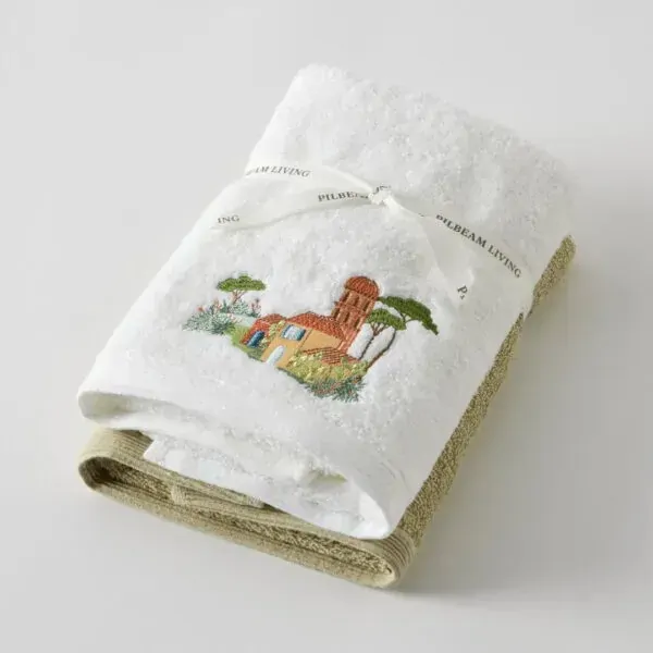Add a touch of charm to daily routines with the Pilbeam Living Valletta Hand Towel Set. This beautifully presented duo includes one embroidered towel featuring a Mediterranean-style villa with surrounding greenery, paired with a plain hand towel in the complementary sage colour. Made from soft, absorbent cotton and tied with a Pilbeam Living ribbon, this set makes a thoughtful gift and a stylish addition to the bathroom.
