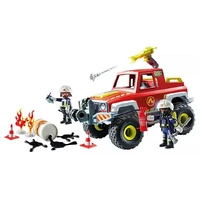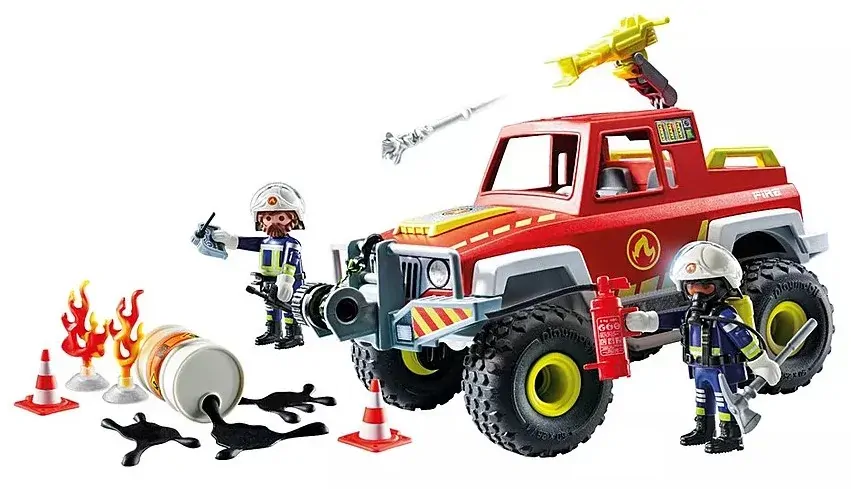 Join the PLAYMOBIL firefighting team on daring rescue missions! This rugged off-road fire truck is built for tough terrains, featuring space for two figures inside its removable roof. Oil patches and flames add dramatic excitement, while the cable winch and water cannon with firing function offer endless play opportunities.