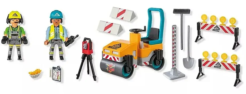 Set includes 2 men with construction helmets, 1 roller with two rotating rollers, 2 traffic barriers with yellow flashing lights, 1 laser measuring device, 1 measuring stick, 2 wedges, 1 shovel, 1 broom, 1 safety vest, 1 notepad, 1 mobile radio telephone.