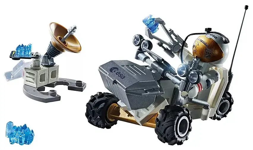Set includes 1 man, 1 Mars vehicle with 2 lights and transport box, 2 steering rods, 1 antenna, 1 small display, 1 solar panel, 1 satellite dish with antenna, 1 large display, 1 cable, 2 feet, 2 rock samples, 1 astronaut helmet, 1 astronaut backpack, 1 oxygen hose, 1 small antenna, 1 gripper, 2 clip-on sleeves.