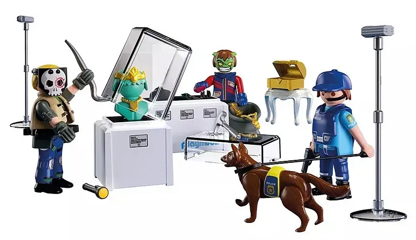Set includes 1 policeman, 2 crooks (male and female), 1 guard dog, 2 museum display cases with jewelry and crown, 2 spotlights, 1 side table, 1 chest with jewels, 2 removable crook masks, 1 rope with hook, 1 hatchet, 1 flashlight, 1 crowbar, 1 sack, 1 police cap with microphone, 1 pistol, 1 safety vest for the dog, 1 dog lead.
