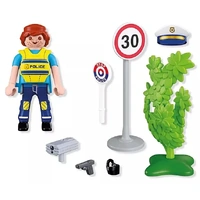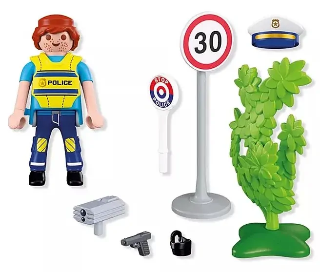 Set includes 1 Police Officer, 1 Police Service Cap, 1 Traffic Paddle, 1 Pistol, 1 Holster, 1 Radar Device, 1 Road Sign, 1 Hedge.