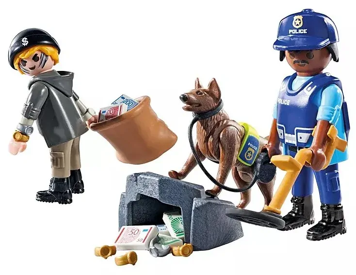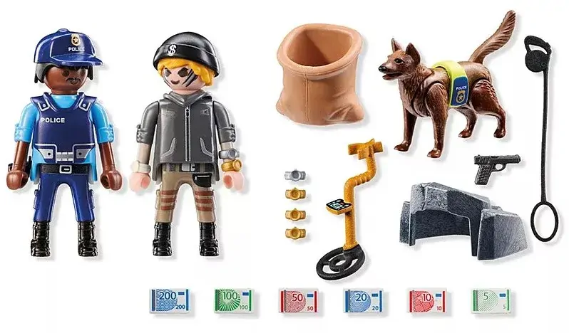 Set includes 1 man with cap, 1 man with police helmet, 1 sheep dog, 1 jute sack, 1 small rock, 1 bundle of money, 6 wristwatches, 1 metal detector, 1 police vest, 1 holster with pistol, 1 dog leash, 1 safety vest for the dog.