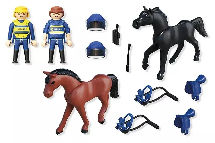 Set includes 1 policeman, 1 policewoman, 2 horses, 2 saddles and halters, 2 riding crops, 1 radio, 1 flashlight, 2 police vests, 2 police helmets with visor.