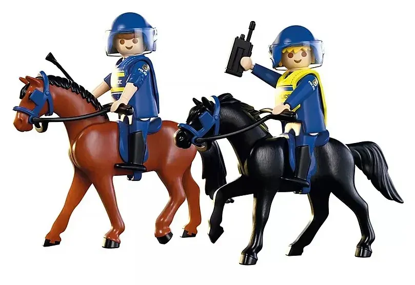 Clip-clop through the city with the PLAYMOBIL Police Squadron! Mounted on their trusty horses, the policewoman and policeman patrol the streets, ready for action with radio, flashlight, and removable vests. The horses are fully equipped with saddles and halters, and the officers wear helmets with visors that flip up for quick commands. Whether directing crowds or racing through narrow alleyways, this PLAYMOBIL playset brings exciting law-enforcement adventures to life. Perfect for little riders and mini officers who love to keep the peace!