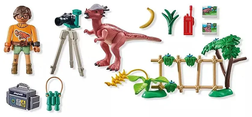 Set includes 1 man, 1 Stygimoloch, 1 grass, 5 flowers, 1 binoculars with strap, 2 base plates, 1 camera, 1 flash, 1 ladder, 1 suitcase, 2 photos, 1 walkie-talkie, 1 banana, 3 overhanging grass, 1 tripod, 1 branch, 2 plants, 2 leaf crowns, 1 arm cuff, 1 wristwatch.