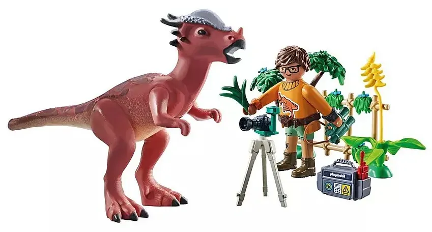 A researcher observes from a safe distance as the red Stygimoloch, known for its impressively robust head, roams the landscape. He skillfully captures these thrilling moments on camera, slightly worried that the dinosaur might spot him and effortlessly tear down the fence. Fortunately, he has brought along some tasty plants to feed the Stygimoloch. Includes a dinosaur knowledge card.