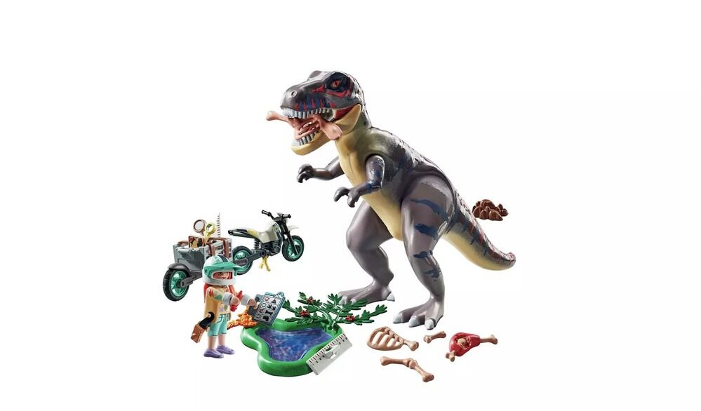 Set includes 1 female figure, 1 Tyrannosaurus Rex, 1 motorbike with trailer, 1 puddle with footprint, 1 branch, instruments for measuring, 1 clipboard, 1 pen, 1 spanner, 1 magnifying glass, 1 camera, 1 map, bones, excrements and 1 dinosaur knowledge card.